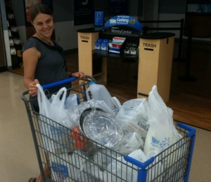 Als wir das erste Mal zum Einkaufen gefahren sind, waren wir ca. 15 Minuten entfernt in einem größeren Laden (Wallmart), in dem man so ziemlich alles findet. Als wir auf die Preise geschaut haben, sind wir aber ganz schön erschrocken. Essen kaufen ist hier gar nicht so billig, wie man gerne hätte… Ein Päckchen Sahne kostet zum Beispiel 2-3 Dollar. Da muss man bei manchem zweimal überlegen, ob man es auch wirklich braucht. Und an der Kasse wird dann alles kostenlos in Tüten verpackt. Manchmal kommen nur ein oder zwei Sachen in eine Tüte und wenn etwas Schweres in einer Tüte ist, dann wird noch ne Tüte darübergestülpt. Da wird man bei einem Einkauf gleich um einige Tüten reicher ;-). Die Tüten lassen sich aber super als Mülltüten verwenden.